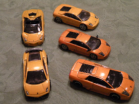 Shown on the right are 3 similar models of the Murciolago - all in roughly the same crazy yellow/orange color (it is cool that all three are so similar). The first (bottom) is the AutoArt version, the middle is from Tomica, and the top is from Hot Wheels. (In fact the next photo includes 2 additional Hot Wheels Lamgorghinis - again in the same color paint).
